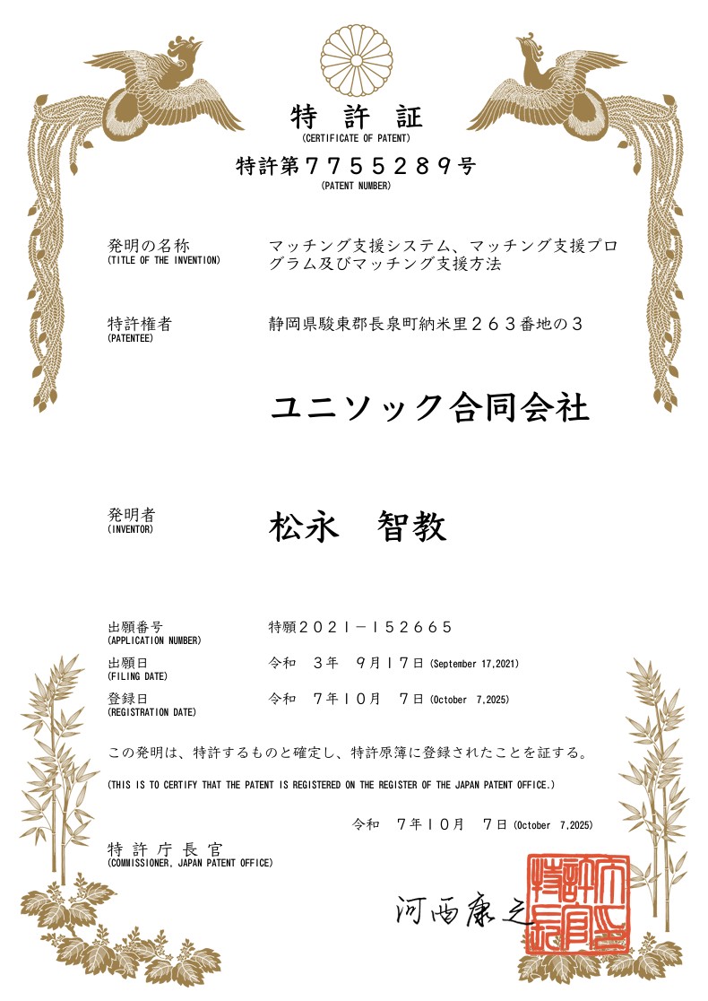 当社のコア技術「マッチング支援システム、マッチング支援プログラム及びマッチング支援方法」について、2025年10月7日付で特許第7755289号の登録が完了しました。